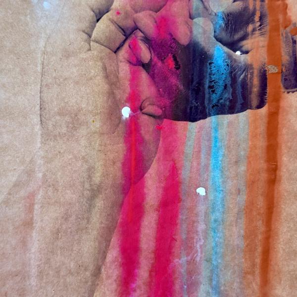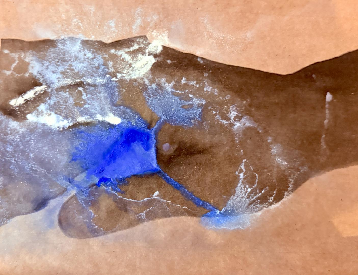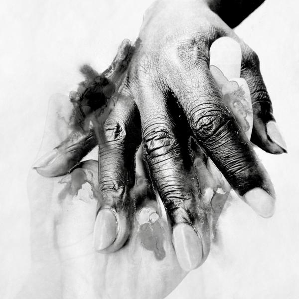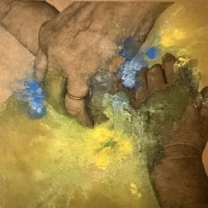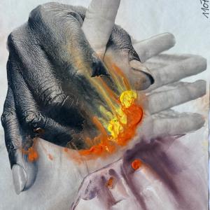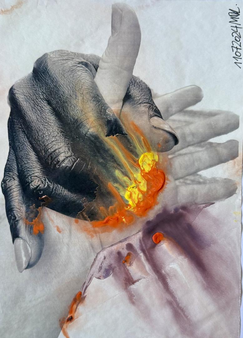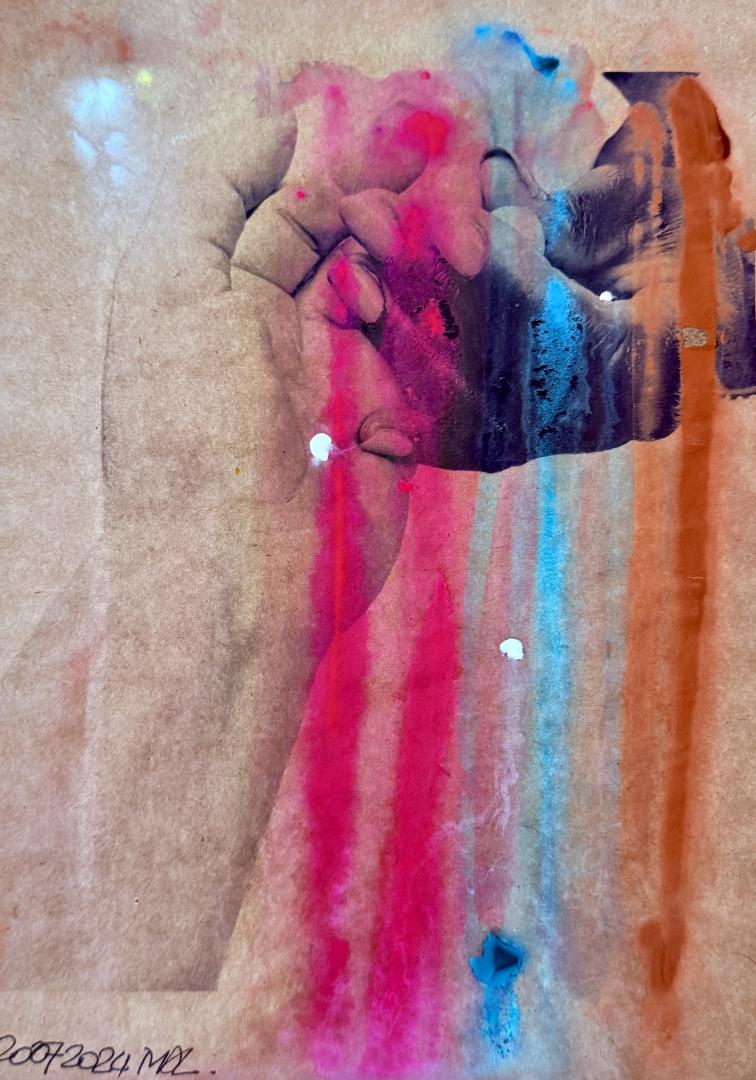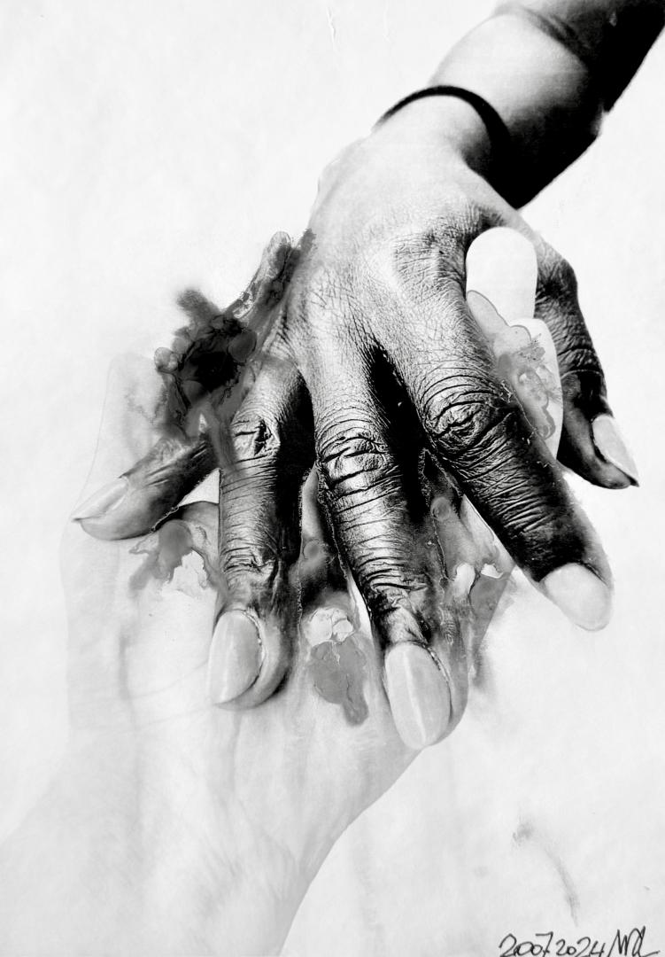 Ce travail s’attache à l’énergie qui se dégage du contact entre deux mains. Une énergie invisible, mais perceptible, que le dessin cherche à représenter. Le geste devient trace, tension, rythme ; la matière en est le support et le révélateur.